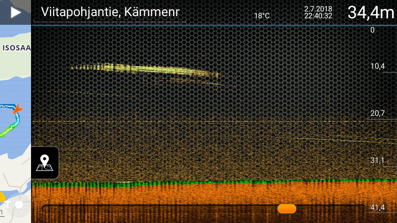 Если вы используете Deeper CHIRP, установите высокий или средний уровень CHIRP-луча и чувствительность 75%. Вот как выглядит слой термоклина на экране сонара CHIRP (дневной цветовой режим):