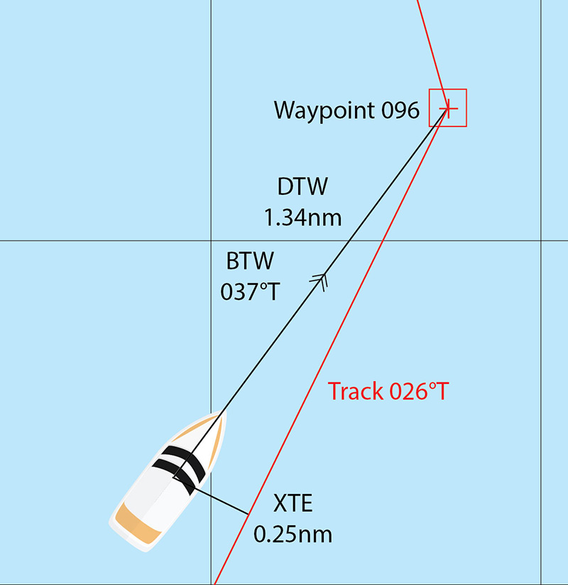 В этом примере азимут нашего исходного пути к маршрутной точке 096 равен 026°T. Поскольку мы отклонились влево и наш XTE составляет 0,25 морских миль, вы можете видеть, что азимут на путевую точку увеличился до 037°T.