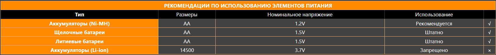 Питается фонарь за счёт батареи AA (LR6) Alkaline /Ni-MH. Можно применять в роли аккумуляторов батареи щелочные и литиевые размером АА. А вот брать аккумулятор литий-ионный типоразмера 14500 категорически запрещено.