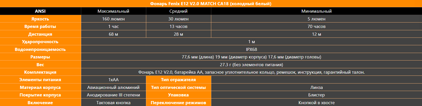 Описание фонаря Fenix E12 V2.0 MATCH CA18 (холодный белый):