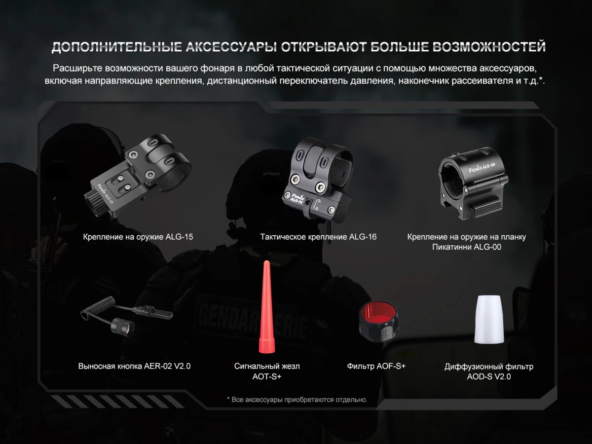 Fenix PD35R размером 136 х 25.4 х 23.2 миллиметра целиком помещается в ладони и имеет вес всего 140 грамм с учетом фирменного аккумулятора. Для расширения функциональности модели допускается применение вспомогательных аксессуаров: подствольных креплений ALG-00, ALG-15 и ALG-16, выносной кнопки AER-02 V2.0, сигнального жезла AOT-S+, диффузионного фильтра AOD-S V2.0 и цветных светофильтров AOF-S+, изменяющих цвет освещения.