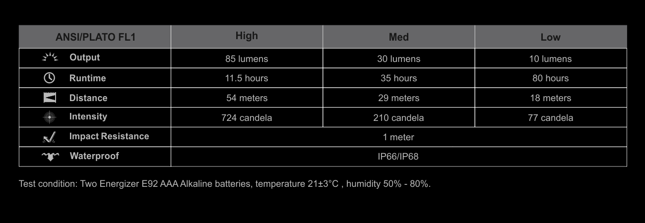 Центром оптического узла этого фонаря является светодиод Cree XP-G2. Универсальный фонарь очень долговечен и будет продолжать работать в течение, по крайней мере, 50 000 часов. Яркость света фонарика составляет 85 люмен в максимальном режиме, помимо которого доступно еще 2.